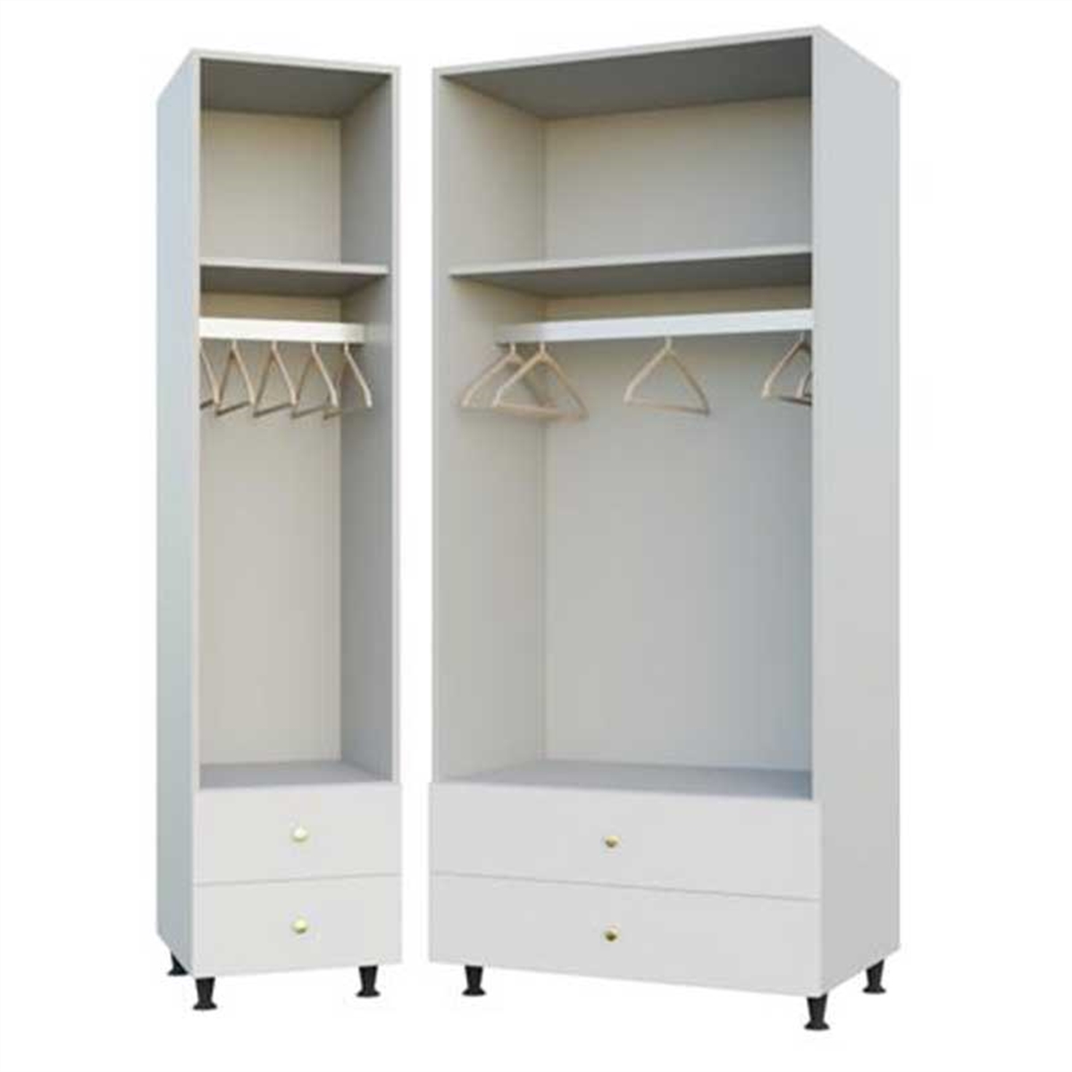 - Wardrobe provides upper hanging space, fixed top shelf with two drawers